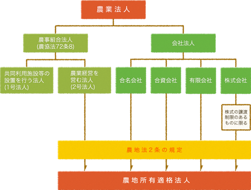 ここで、農業法人について少し整理をしたいと思います。現在、農業を行う法人の種類は大きく分けて「会社法人」と「農事組合法人」の2種類になります。また法人が農地を持つには「農地所有適格法人」の資格を取得する必要があります。 会社法人は、「株式会社」をはじめとして、基本的には一般的な会社と同じものになります。