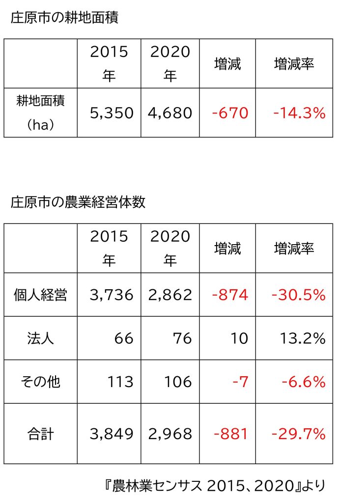 本題に入る前に、数字の確認です。農林業に関わる統計をしている『農林業センサス』の直近2回にあたる2015年と2020年で、庄原市の基本的な数字を確認しておきます。