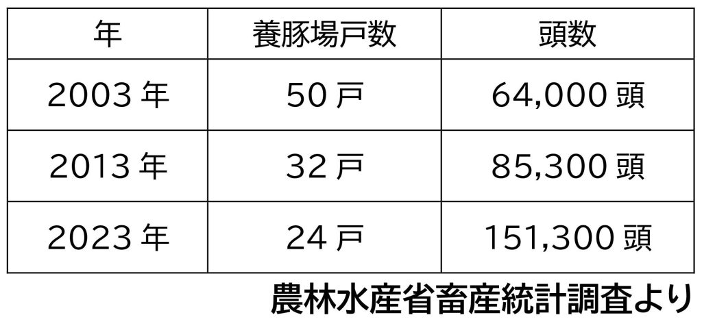 養豚業界も他の業界同様に大規模化と中小の養豚場の減少が続いています。農林水産省の畜産統計調査で見ると、広島県では2003年には50戸あった養豚場が、2013年には32戸、2023年には24戸となり20年間で半減しています。